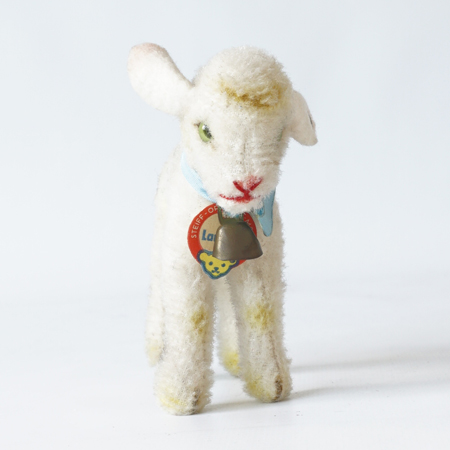 Lamb’s wool plush, white, standing, bell and part of silk ribbon