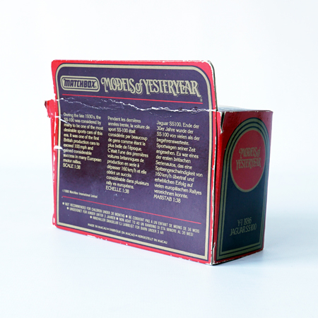 Models of Yesteryear, Y1/3, 1936 Jaguar SS100 Year car: 1986 Color: Yellow Scale: 1:38 Boxtype: J (Diaramabox) Manifactured: Macau