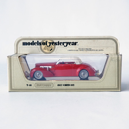 Models of Yesteryear, Y18/1, 1937 Cord 812 Coupé Year car: 1978 Color: Red and White hood Scale: 1:48 Boxtype: Box I Manifactured: Great Britain