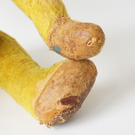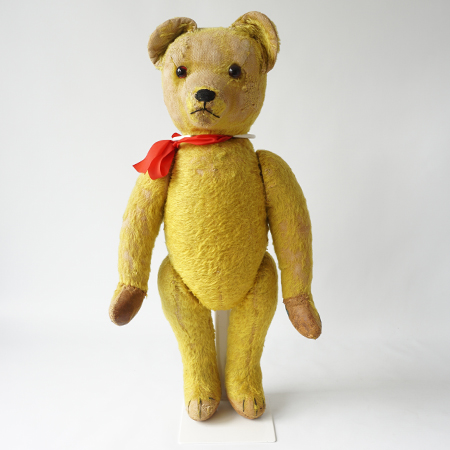 Information: woodwool stuffed, arms and legs felt, 3 toes and 3 claws, jointed arms and legs, glass eyes, stand not included, voice is not working