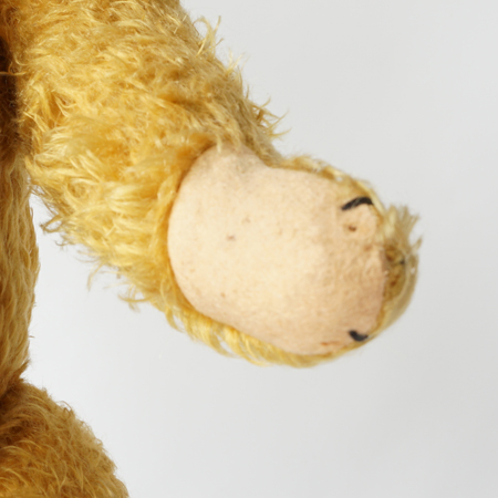 Information: woodwool stuffed, set in muzzle of clipped mohair, 3 toes and 3 claws, jointed arms and legs of cardboard, plastic eyes, stand not included, voice is not working