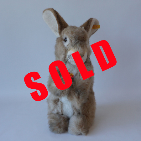 Rabbit Putsi Year 1993-1997 EAN 077876 Button, flag, shield and ticket Height 40 cm Woven fur, gray-beige, begging, machine washable